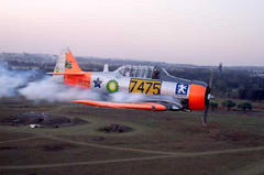 Despite my infatuation with the Spitfire, I just never had any significant contact with the machine, until Saturday, September 29, 2001, when I received an assignment from Mike de Villiers, the managing editor of SA Flyer, to cover, as freelance reporter, certain aspects of the air show at Newcastle, and was given a lift by Arnie Meneghelli in one of his four superb Harvards. The freelance photographer who was also assigned to do a photo shoot for SA Flyer was Frans Dely and he occupied the back cockpit of one of the other Harvards in the formation. The other pilots in the formation, that was led by Arnie Meneghelli, were Johan Dries, Shaun Thackray and Gavin Brown.